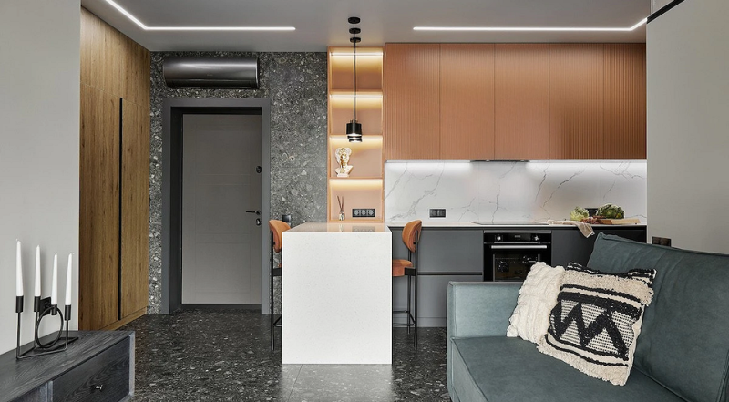 Здесь свет — это в первую очередь вопрос безопасности и удобства. Одной центральной точки мало, так как, стоя у столешницы, вы собственной тенью перекрываете свет. Поэтому основное внимание стоит уделить рабочей зоне: например, провести под верхними шкафами светодиодную ленту или подсветить полки внутри. Для потолка подойдут точечные или трековые светильники.